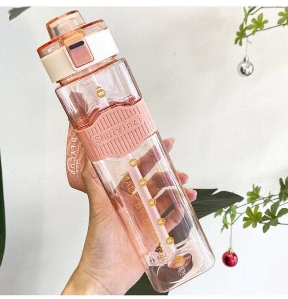 Generic - جيني زجاجة مياه مربعة من الاكريليك مع ماصة ومقبض سيليكون بينك وزر قفل امان وحزام كتف سعة 720 مل من اس جي