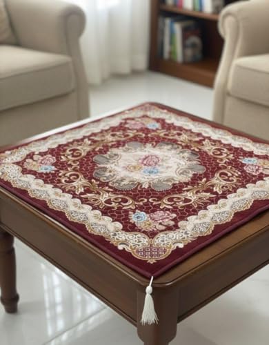 Generic - جيني مفرش طاولة مربع بنمط زهور، احمر بورغندي، 100 × 100 سم، غطاء طاولة قهوة مبطن سميك مع شراشيب. فلو