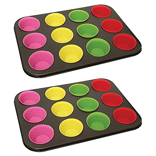 Spaceshoop - قالب كب كيك مقاوم للالتصاق من الفولاذ المقاوم للصدأ، مزود بـ 12 فتحة سيليكون، طقم من 2 قطعة - متعدد الألوان
