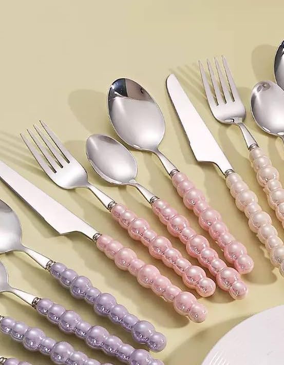 - تصميم أنيق: تتميز مجموعة الملاعق المصنوعة من الستانلس ستيل بمقابض مزينة بخرز اللؤلؤ بألوان الباستيل الجميلة، مما يضيف لمسة من الرقي إلى طاولة الطعام الخاصة بك