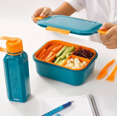 - ألوان متنوعة: تضيف درجات اللون الأزرق المخضر والبرتقالي لمسة ممتعة ونابضة بالحياة لروتين الغداء، بينما توفر الأدوات المرفقة مزيدًا من الراحة.