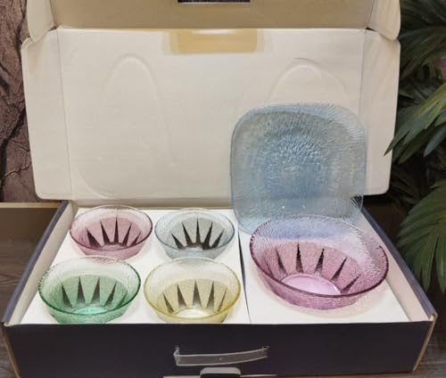 - مجموعة كاملة: طقم تقديم زجاجي مكونة من 6 قطع يتضمن بولة كبيرة مزخرف وطبق مربع مسطح و4 بولات صغيرة ملونة لتلبية احتياجات الطعام والتقديم المتنوعة.
