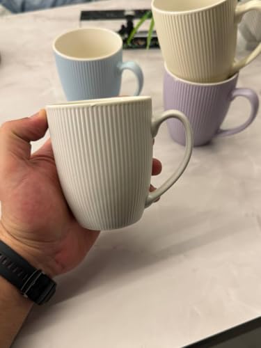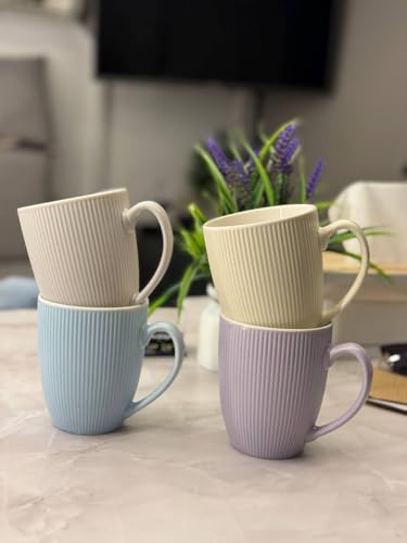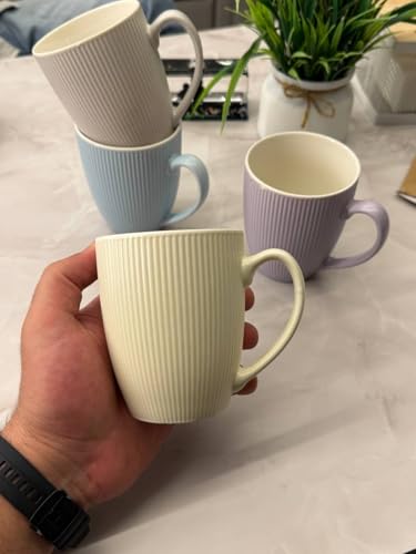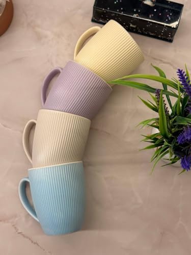 - مزايا التصميم: أكواب بورسلين مزخرفة جميلة بنمط عمودي مضلع، متوفرة بألوان باستيل ناعمة بما في ذلك الكريمي واللافندر والأبيض والأزرق الفاتح.