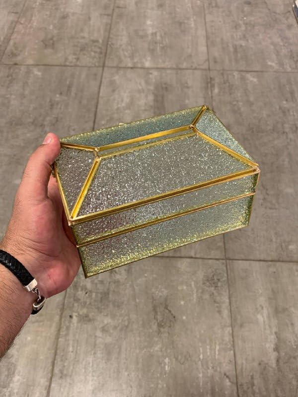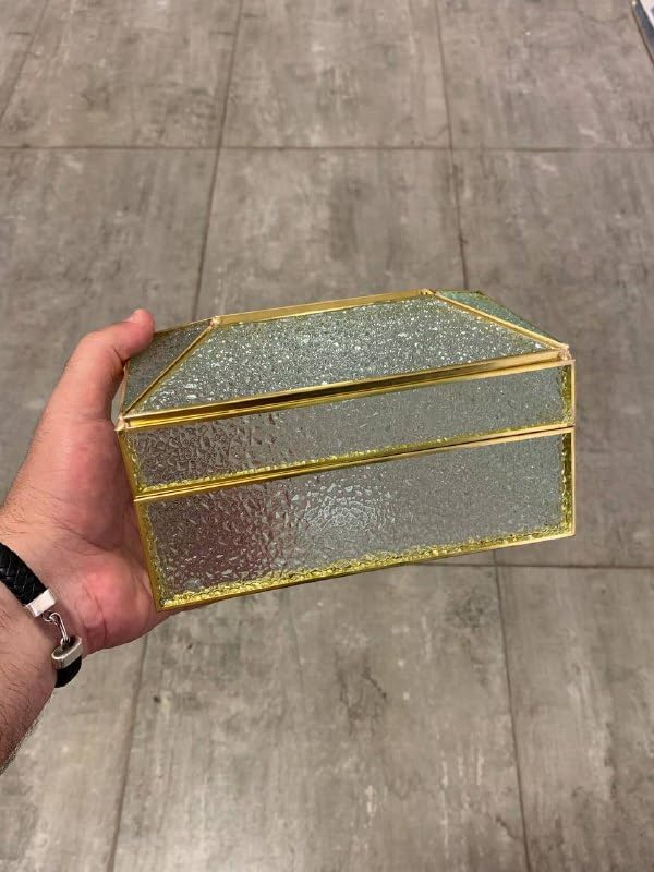 - تصميم أنيق: صندوق مناديل شفاف يتميز بمزيج متطور من الإطار المعدني مع زخرفة ذهبية وألواح زجاجية مزخرفة تضيف لمسة فاخرة إلى ديكور أي غرفة