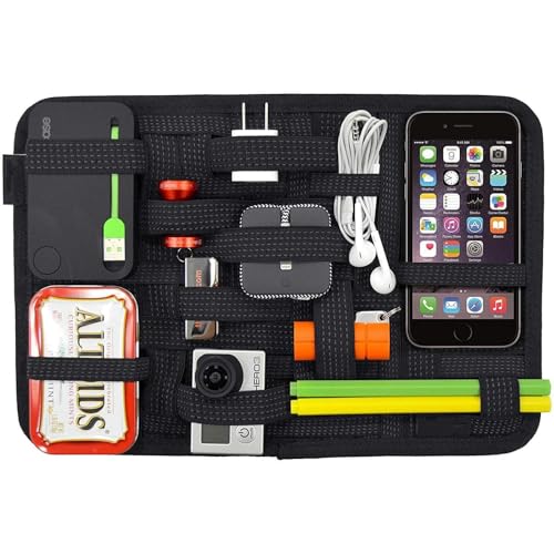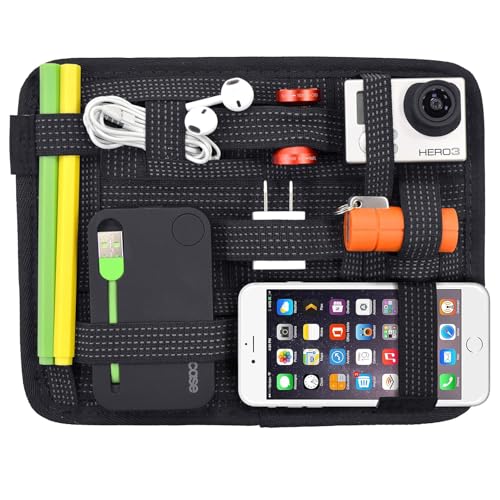 - نظام مطاطي مرن: يعتمد المنظم على شبكة من الأربطة المطاطية القوية التي يمكنها تثبيت الأدوات بأحجام مختلفة، مثل الكابلات، الشواحن، سماعات الأذن، وأدوات المكياج. هذا النظام المرن يسمح لك بتنظيم الأدوات حسب احتياجاتك الشخصية.