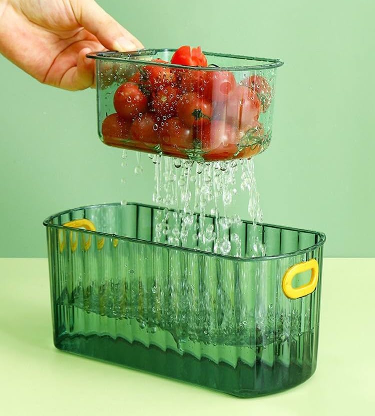 - وظائف متعددة الاستخدامات: تعمل الحجرة العلوية كطبق وجبات خفيفة مريحة ومصفاة مع فتحات تصريف، بينما تجمع الطبقة السفلية الماء الزائد وتوفر مساحة تخزين إضافية
