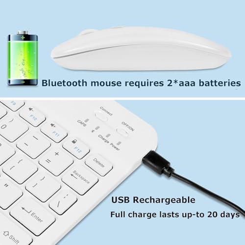 - مجموعة لوحة مفاتيح وماوس بلوتوث صغيرة رفيعة للغاية محمولة وقابلة لإعادة الشحن تعمل لمدة 150 ساعة بلون أبيض.
