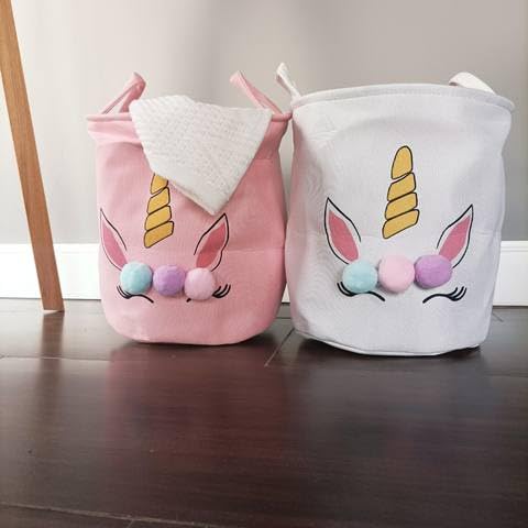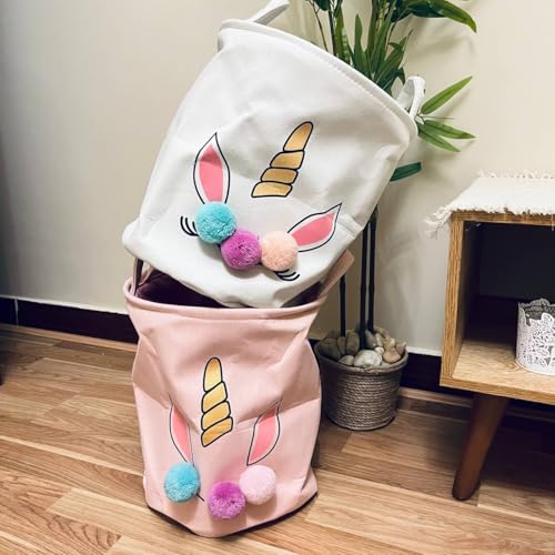 - مزايا التصميم: سلة تخزين بطابع حصان وحيد القرن اللطيف مع كرات فرو زينة مزخرفة، وتفاصيل قرن ذهبي، وأذنين ورديتين على خلفية من الكتان الأبيض.