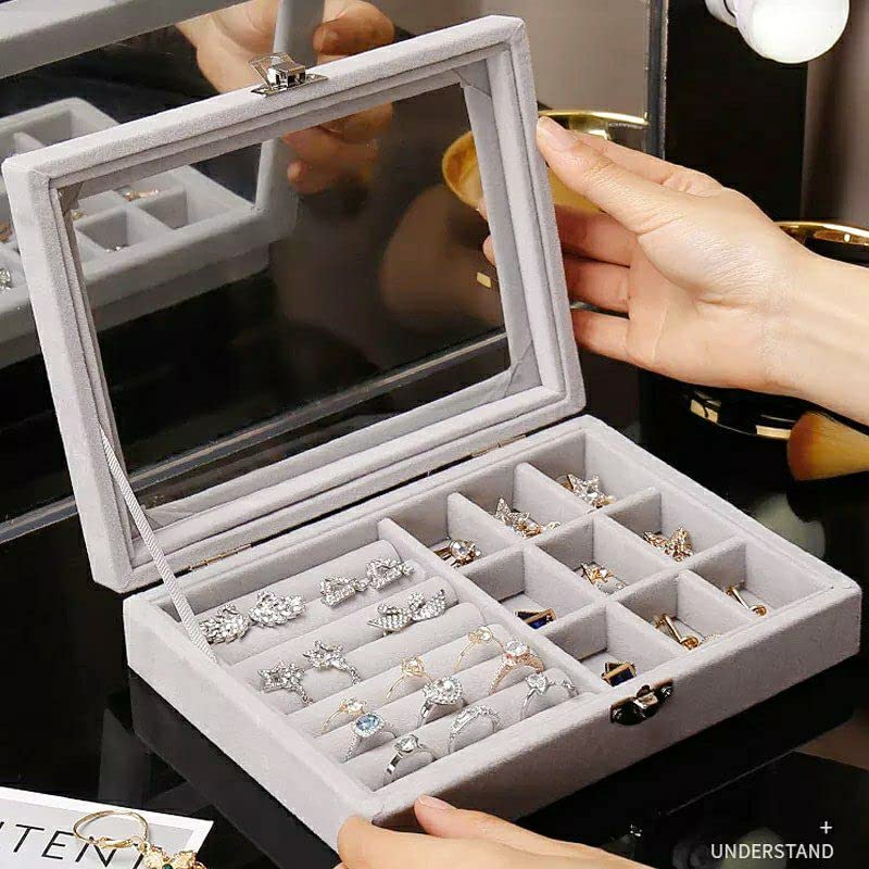 - منظم اكسسوارات قطيفه شيك جدا وحجمها مناسبه تقدري تخديها معاكي ف الشنطه في الرحلات والمصايف وكمان هتحفظلك ع اكسسواراتك من التلف والضياع