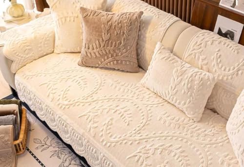 Generic - جيني طقم غطاء اريكة مخملي من فرو الجاكار الصناعي، خامة مستوردة، اريكة كبيرة 195 سم × 90 سم مع 3 اغطية وسائد 48 سم × 65 سم، (لون بيج)