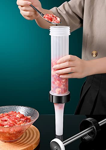 - 【حقنة سهلة】 يرجى وضع اللحم المقابل في دلو النقانق، وإمساك المقبض المريح، ودفع الحشوة في الماكينة لملء النقانق والحفاظ على سطحه. تصميم قابل للفصل بالكامل، سهل التنظيف بعد كل استخدام.