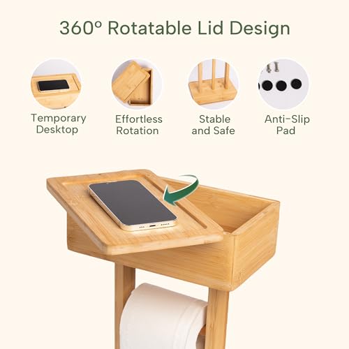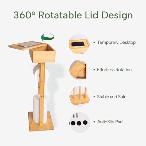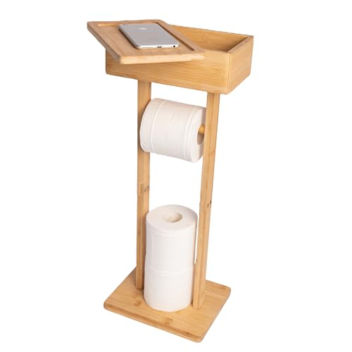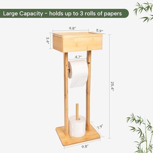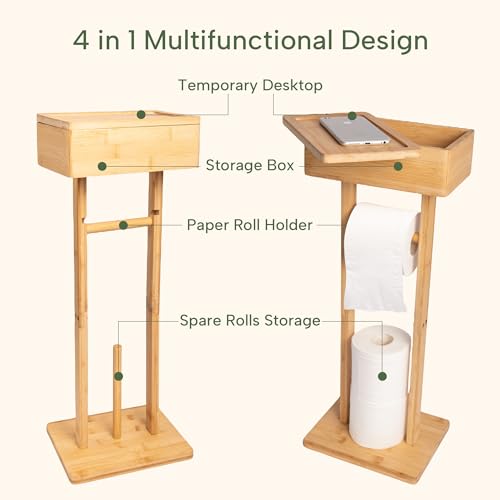 GENMOUS & CO. - حامل ورق تواليت من البامبو مع رف، حامل ورق تواليت قائم بذاته 4 في 1 حامل مناديل تواليت تخزين مناديل مبللة، مع موزع لـ 3 بكر إضافية، اكسسوارات منظم الحمام من جينموس