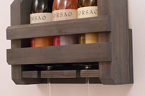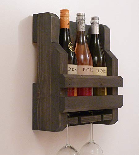 Genuine Decor - رف مشروبات يثبت على الحائط من جينيون ديكور مكون من 3 زجاجات و2 حامل اكواب نبيذ، رف نبيذ ريفي يثبت على الحائط، رف خشبي بتصميم ريفي للهنود الاوائل، لون اسود
