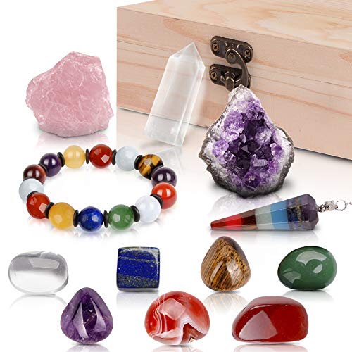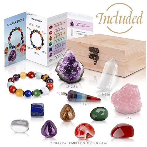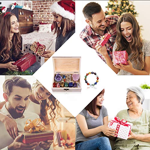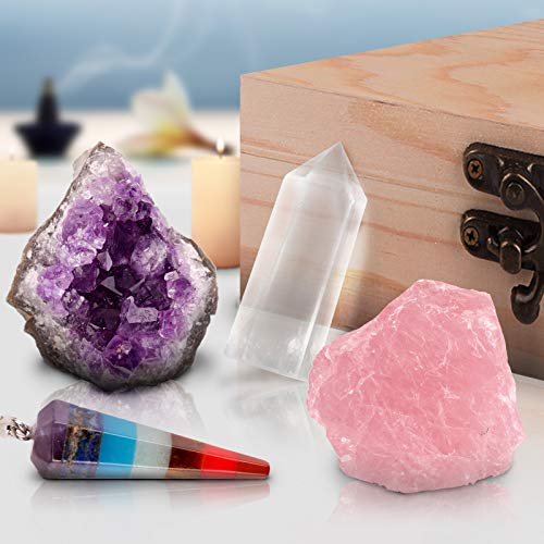 Etelent - مجموعة كريستالات علاجية اصلية سوار في صندوق خشبي 7 احجار شاكرا ريكي كوارتز وردي جمشت نقاط كريستال بندول