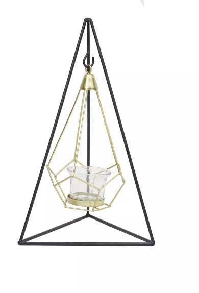 - تصميم عصري: حامل شموع معلق هندسي مذهل يتميز بحامل مثلث معاصر من المعدن الأسود مع حامل هندسي ذهبي أنيق