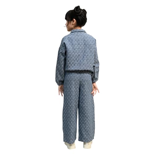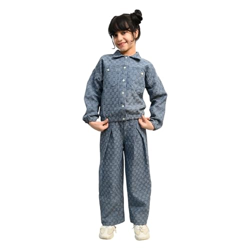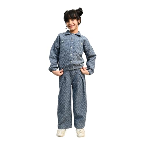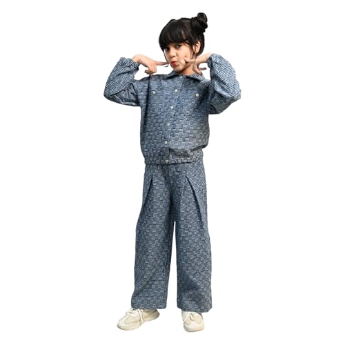 Generic - سوت بناتي بقطعتين بنقشة هندسية، قميص بأكمام طويلة وسروال واسع، لون كحلي وأبيض، قماش جينز دينم، للأعمار من 5 إلى 8 سنوات
