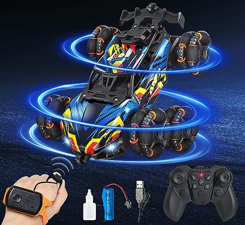 KIYTARBOO - سيارة بهلوانية بجهاز تحكم عن بعد بمستشعر ايماءات مع ضوء وموسيقى - سيارة انجراف بجهاز تحكم عن بعد 2.4GHz، دفع رباعي مزدوج الجوانب دوران 360 درجة للطرق الوعرة للاولاد والبنات من سن 6 الى 12 سنة
