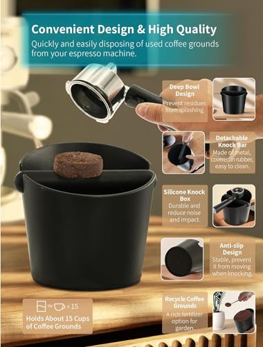 - سهولة التخلص مع صندوق الضربة القاضية الذي يوفر مساحة تخزين واسعة لبقايا القهوة المطحونة، ويسمح بالتخلص السريع واليسير من القهوة المطحونة على بعد بوصات قليلة من ماكينة تحضير الإسبرسو، مع إمكانية إعادة استخدام القهوة المطحونة القديمة كسماد غني للبستنة في حديقتك.