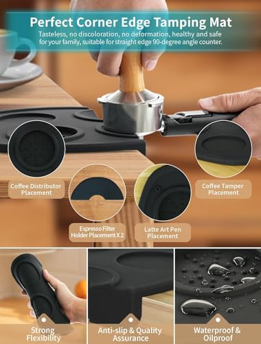 - مواد عالية الجودة وموثوقة - بساط مكبس الإسبريسو مصنوع من مادة السيليكون الآمنة غذائيًا وناعم جدًا، يمكن الضغط عليه بإحكام على طاولة العمل لتجنب الانزلاق وتحسين ثبات وتساوي المكبس عند تحميل القهوة، حتى بالنسبة لطاولات العمل الصغيرة.
