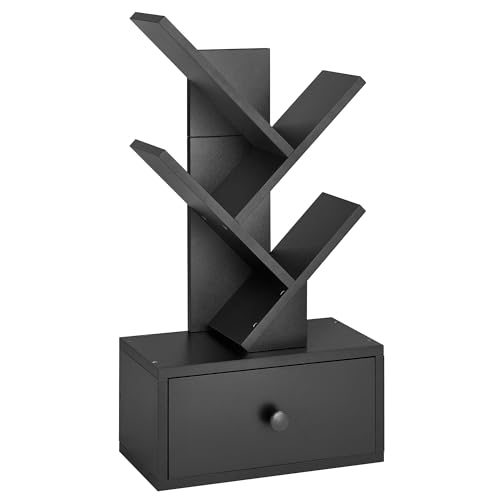 Gewudraw - رف كتب على شكل شجرة من 4 طبقات مع درج جيودراو خزانة ارفف منظمة عصرية قائمة الارض لغرفة النوم وغرفة المعيشة والمكتب المنزلي اسود خشب