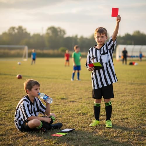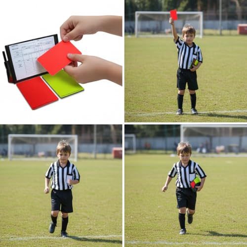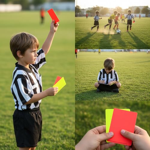 - تتضمن مجموعة بطاقات كاملة: تأتي مع بطاقات تحذير حمراء وصفراء لإدارة مباريات كرة القدم، مما يسمح للحكام بالحفاظ على التحكم والانضباط المناسبين في اللعبة.