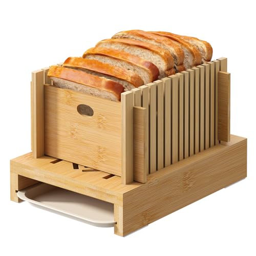 GHWIE - جي اتش دبليو آي اي قطاعة خبز للخبز المنزلي من الخيزران مع صينية دليل تقطيع الخبز قابل للتعديل لوح صغير والكعك والخبز