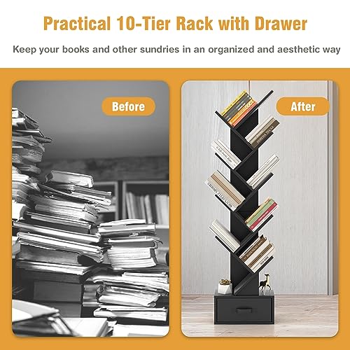 GIANTEX - خزانة كتب على شكل شجرة من 10 طبقات، رف كتب قائم بذاته على الأرض بدرج للأقراص المدمجة والأفلام والكتب، منظم تخزين كتب من الخشب لتزيين أثاث المنزل لغرفة المعيشة وغرفة النوم والمكتب من جاينتكس (أسود)