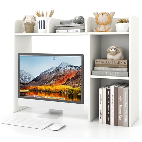 Giantex - منظم مكتب خشبي لشاشة كمبيوتر 27 بوصة، رف عرض وتخزين لسطح العمل مع 5 أرفف، خزانة كتب ومكتب متعددة الأغراض للمسكن والمكتب والمنزل، رف كتب مكتبي من جيانتكس، أبيض
