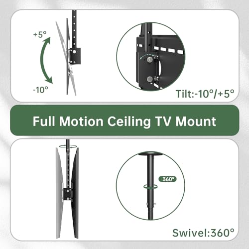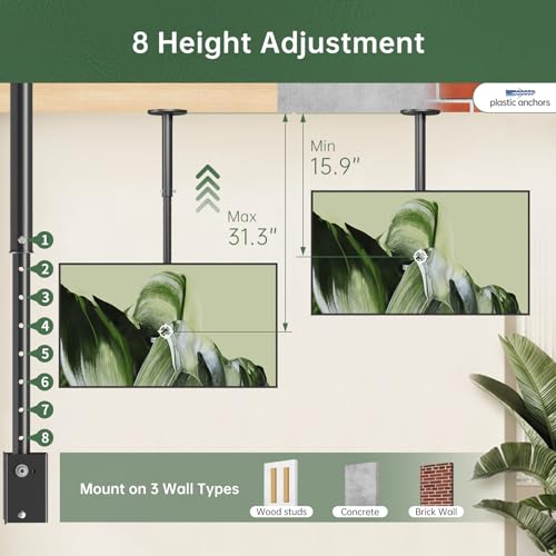 - تعديل الارتفاع والحركة الكاملة: حامل تلفزيون يثبت على الحائط بارتفاع قابل للتعديل من 8 مراحل يتراوح بين 40 إلى 80 سم، مع إمكانية ميل من -10° إلى +5°، ودوران 360° حول عمود الحامل العلوي مما يوفر زاوية مشاهدة مثالية.