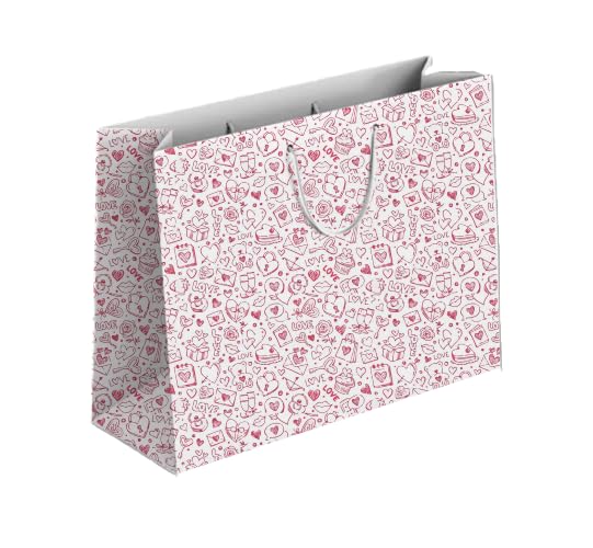 Generic - شنطة هدايا، بيضاء بنقوش بلون وردي، حجم كبير، يد من الحبل، مناسبة لأعياد الميلاد