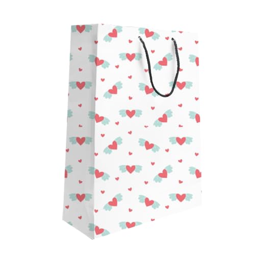- تصميم ساحر: حقيبة هدايا بيضاء مزينة بنمط مبهج من القلوب الزهرية والأزرق المخضر، مثالية للمناسبات الرومانسية أو أعياد الميلاد أو الاحتفالات