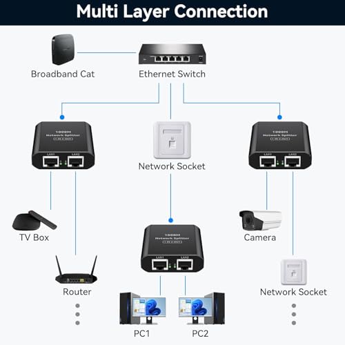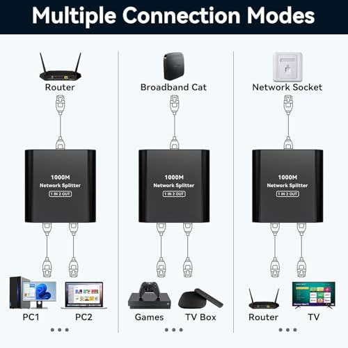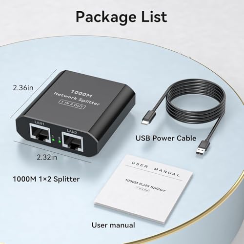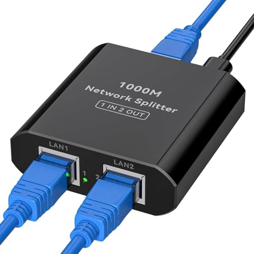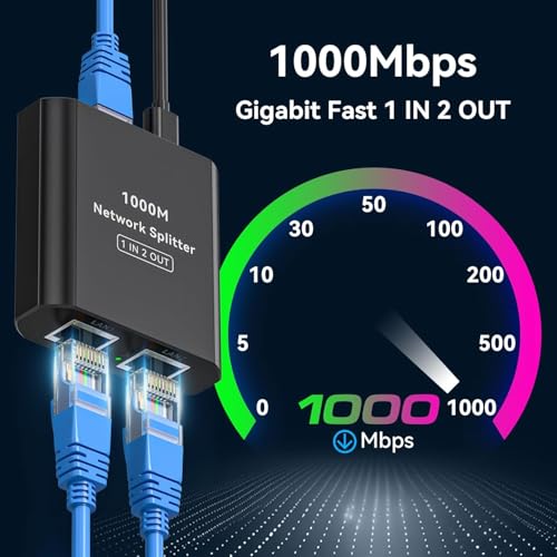 Generic - موزع جيجابت ايثرنت 1 الى 2 - مقسم شبكة محلية عالي السرعة 1000 ميجابت لكل ثانية، مفتاح شبكة بـ2 منفذ مع كابل طاقة USB نوع C، موزع RJ45 للراوتر والموزعات والتلفزيون وأجهزة فك التشفير