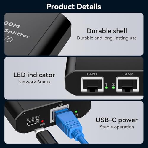 - انترنت جيجابت عالي السرعة: يوفر 1000 ميجابت لكل ثانية للوصول السريع والثابت إلى الانترنت. دعم الأجهزة المزدوجة: يسمح لك بتوصيل جهازين من منفذ ايثرنت واحد. كابل طاقة USB نوع C: يتضمن كابل USB نوع C لتركيب سهل وسريع. توافق واسع: مثالي لأجهزة الراوتر والموزعات وأجهزة التلفزيون وأجهزة فك التشفير والمزيد. تصميم موثوق ومتين: مصممة لأداء يدوم طويلًا مع الحد الأدنى من التداخل.