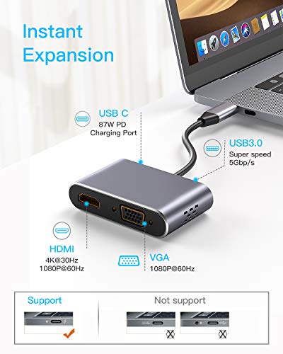 - 【موزع USB نوع سي متعدد الوظائف】قم بتوسيع منفذ USB نوع C الخاص بك إلى HDMI ومخرج VGA وUSB 3.0 ومنفذ شحن USB-C. يسمح لك بتوسيع سطح المكتب إلى شاشتين خارجيتين عبر كابل HDMI وVGA؛ يعمل بشكل مثالي في الألعاب والعمل والترفيه.