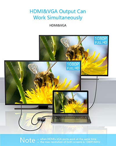 - 【محول USB C إلى HDMI VGA】يدعم منفذ HDMI 4K UHD 3840 × 2160 عند 30 هرتز؛ شاشة في جي ايه تصل إلى 1080 بكسل عند 60 هرتز فل اتش دي. عندما يعمل منفذان في وقت واحد، فإن الدقة القصوى للاثنين هي 1920 × 1080 بكسل عند 60 هرتز. ملاحظة: وضع التمديد، بينما يعمل vga وhdmi في نفس الوقت، تظهر شاشتان نفس المحتوى فقط. (ملاحظة: لا تدعم شاشتين لعرض محتوى مختلف بشكل منفصل.)