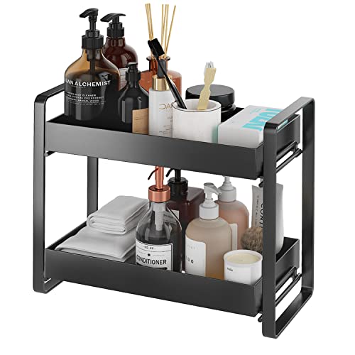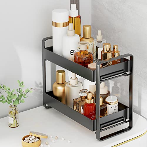 GILLAS - جيلاس منظم منضدة الحمام من طبقتين رف للمكياج ومستحضرات التجميل صينية تخزين فانيتي حامل قائم على المنضدة اسود معدن