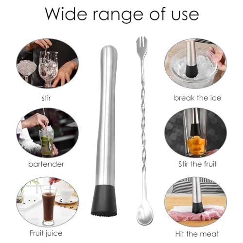 - مجموعة صنع الكوكتيل متعددة الاستخدامات: تتضمن مجموعة ملاعق الكوكتيل متعددة الوظائف الخاصة بنا اثنين من أدوات خلط المشروبات لسهولة الخلط والتبريد. مناسبة لكل من السقاة المحترفين والهواة، تمكنك هذه المجموعة من صنع مجموعة متنوعة من الكوكتيلات مثل فودكا مارتيني والطراز القديم والموهيتو دون عناء.