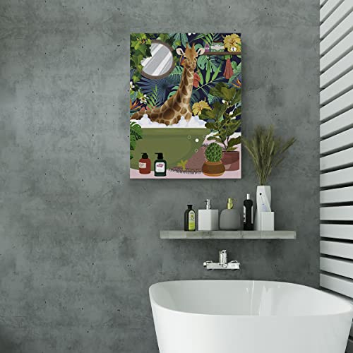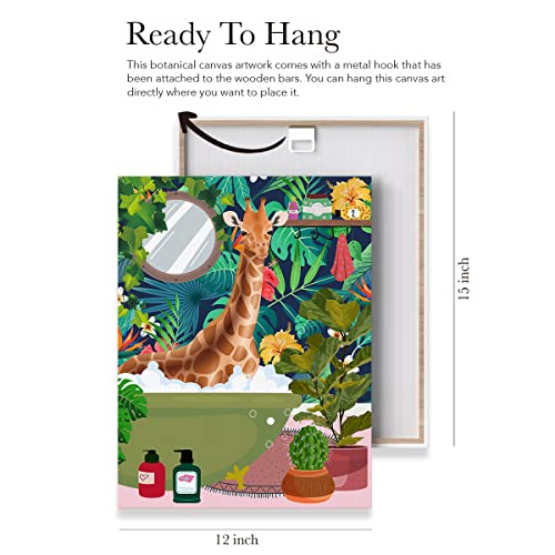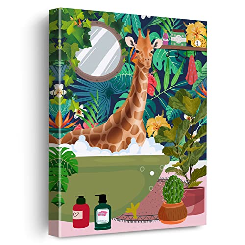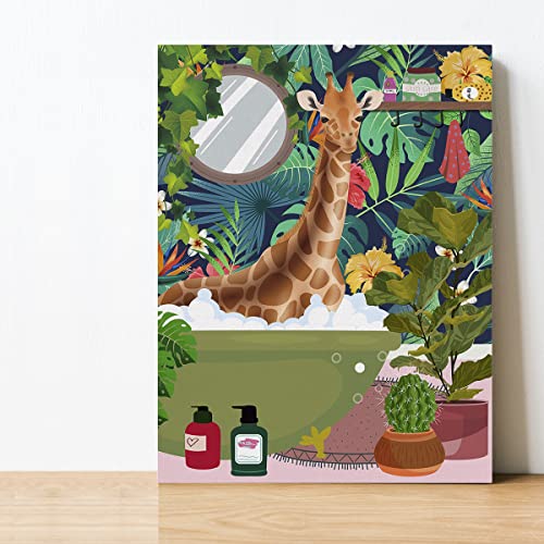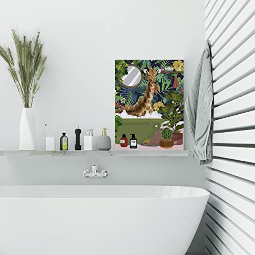 EVXID - ملصق قماش بتصميم زرافة في حوض الاستحمام، لوحة فنية جدارية للحمام، صورة زرافة الغابة الاستوائية، عمل فني مؤطر جاهز للتعليق لتزيين جدار المرحاض 12 × 15 انش، متعدد الألوان