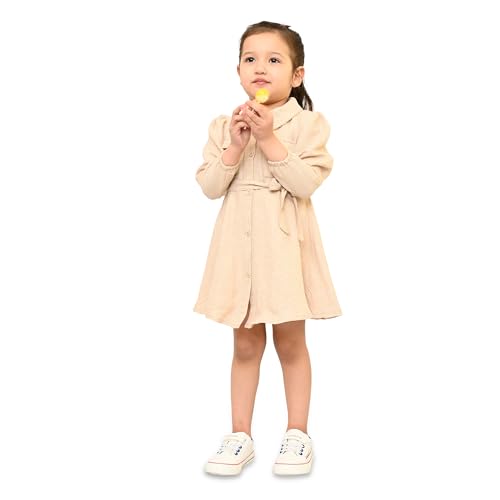 Generic - فستان بناتي مصنوع من القطن والكتان، بتصميم بياقة، بأكمام طويلة، مع جيوب وحزام قابل للتعديل ورسغ مطاطي، متوفر بألوان بني ومنت وأخضر وكشمير وأزرق وبيج، مقاس 2-4 سنوات