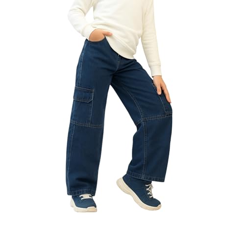 Generic - بنطلون جينز كارجو واسع للبنات، لون أزرق غامق، مقاسات من 4-16 سنة، تصميم عصري