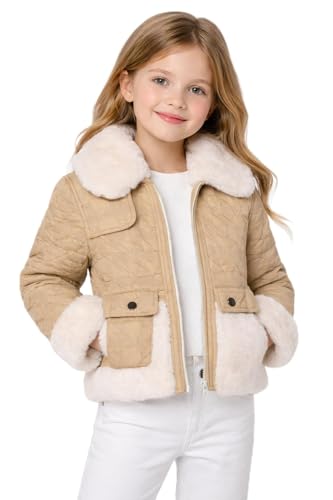 Generic - جاكيت فرو صناعي للبنات مع حواف من الفرو، بيج/بينك، سحاب امامي، تصميم مبطن، معطف شتوي