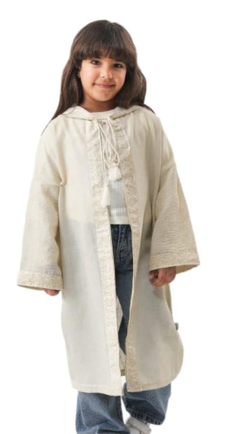 Generic - قفطان بغطاء راس للبنات، كريمي، بحواف مطرزة، كم طويل، نمط تقليدي، مقاس 9-10
