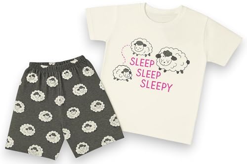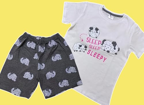 Generic - طقم للبنات – قطن – قطعتين – سادة بطباعة خروف نعسان – تيشرت نصف كم + شورت (رمادي قصير – تي شيرت ابيض، مقاس 9-8-9 سنوات)