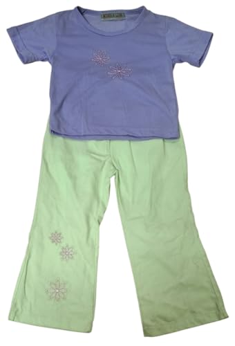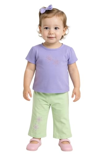 Generic - طقم خروج بناتي صيفي قطن لعمر سنتين - تيشيرت بنفسجي وبنطلون أخضر - تطريز زهرة ناعم - لبس أطفال مريح وأنيق.