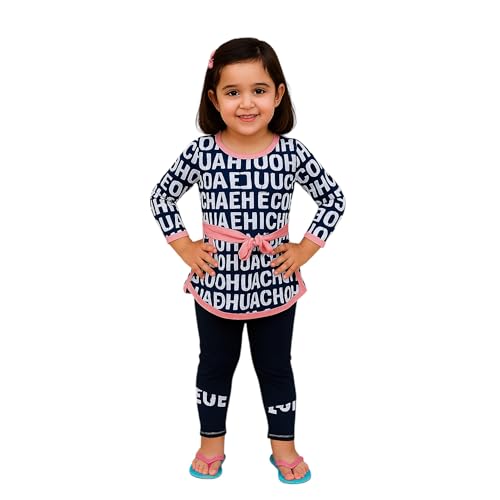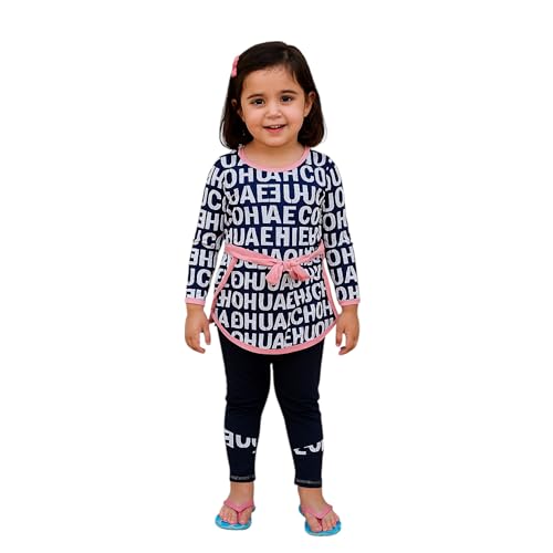 Generic - مايوه بناتي ثلاث قطع، بلوزة كحلي بنقشة حروف وحزام وردي، بنطلون كحلي، مع بونيه للسباحة