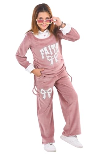 Generic - طقم بدلة رياضية للبنات، بينك، طباعة رسومات فيث، سويت شيرت وبنطلون مضلع، مزين بفيونكة