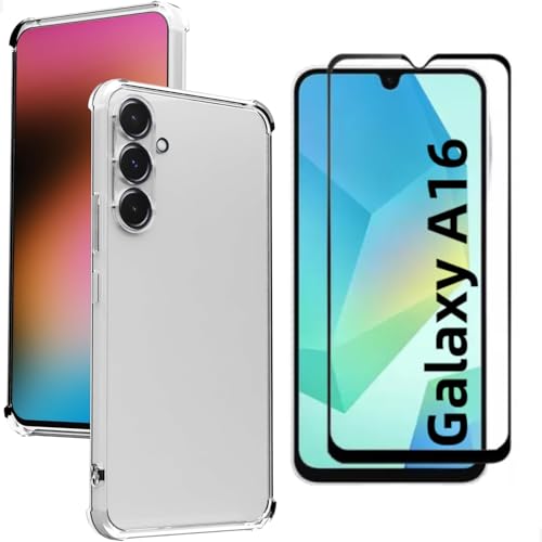 GL cases - طقم جرابات حماية مضادة للصدمات متوافقة مع موبايل سامسونج جالاكسي A16 من السيليكون الشفاف والمرن والمقوى، مع شاشة حماية من الزجاج المقوى ثلاثية الأبعاد بدرجة صلابة 9 من جي ال كيسز
