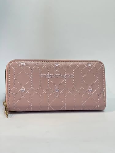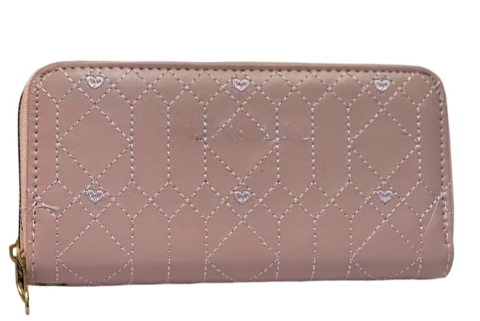 GLAMIA - محفظة مبطنة بسحاب كامل للنساء من جلاميا، جلد بيج، خياطة بنمط هندسي، قطع معدنية ذهبية - 37 (بينك)