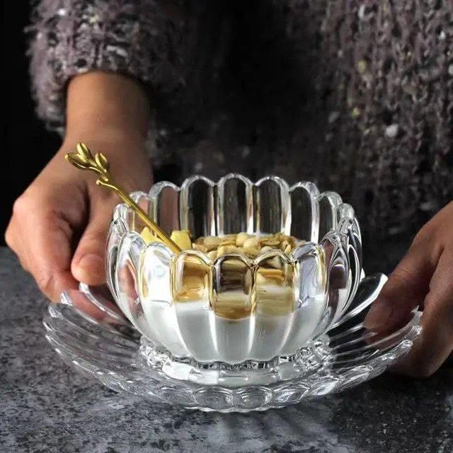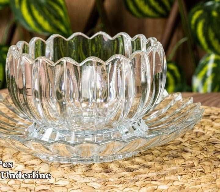 - مجموعة كاملة: طقم عشاء زجاجي مكون من 12 قطعة يتضمن 6 أوعية أنيقة بتصميم كريستالي و6 ألواح سفلية مزخرفة متطابقة لإعداد طاولة متناسق
