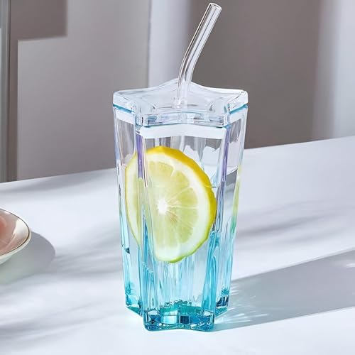 Generic - مج قهوة زجاجي بغطاء على شكل نجمة - مصمم للمشروبات الساخنة والباردة، مثالي للقهوة المثلجة والشاي والكوكتيلات مع غطاء مقاوم للانسكاب